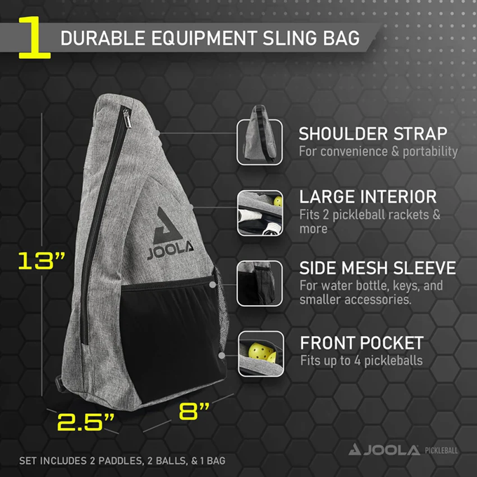 Two JOOLA Essentials Pickleball Paddles, two JOOLA Primo Balls, and a JOOLA Essentials Sling Bag are included in this set. The JOOLA Essentials Paddles' response polymer core with fiberglass surface provides great pop. This JOOLA Essentials Pickleball Set is great for recreational players looking to play with family and friends.
